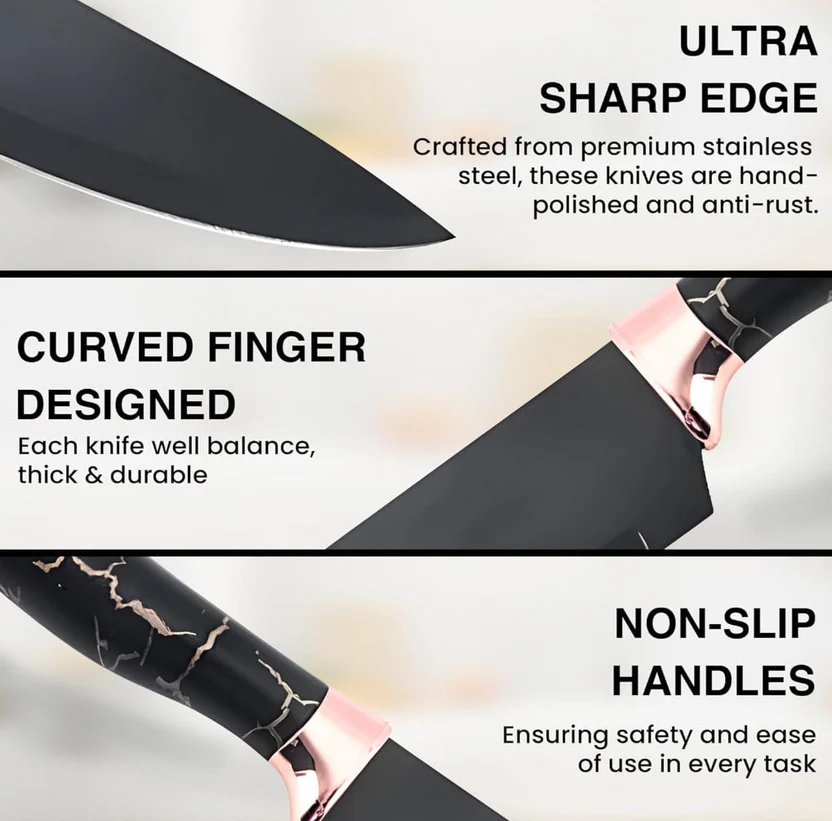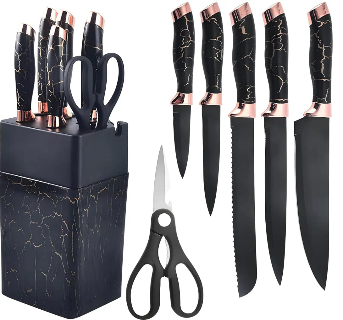 طقم سكاكين مطبخ من الفولاذ المقاوم للصدأ مكون من 7 قطع من SHOPPING VIBES – سكين طاهٍ حاد، مقص، مبراة (مقبض رخامي)