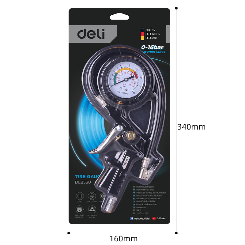 The Deli EDL8530 Tire Gauge is designed for accuracy and durability, ideal for maintaining optimal tire pressure. It offers a measuring range of 0-16 bar, and the dual unit dial enhances readability. Constructed from solid aluminum alloy, this hand plank gauge is both sturdy and reliable. A shock-resistant jacket protects the gauge against impacts, ensuring long-lasting performance. This tool is essential for anyone seeking precise tire pressure monitoring for safer and more efficient vehicle operation.